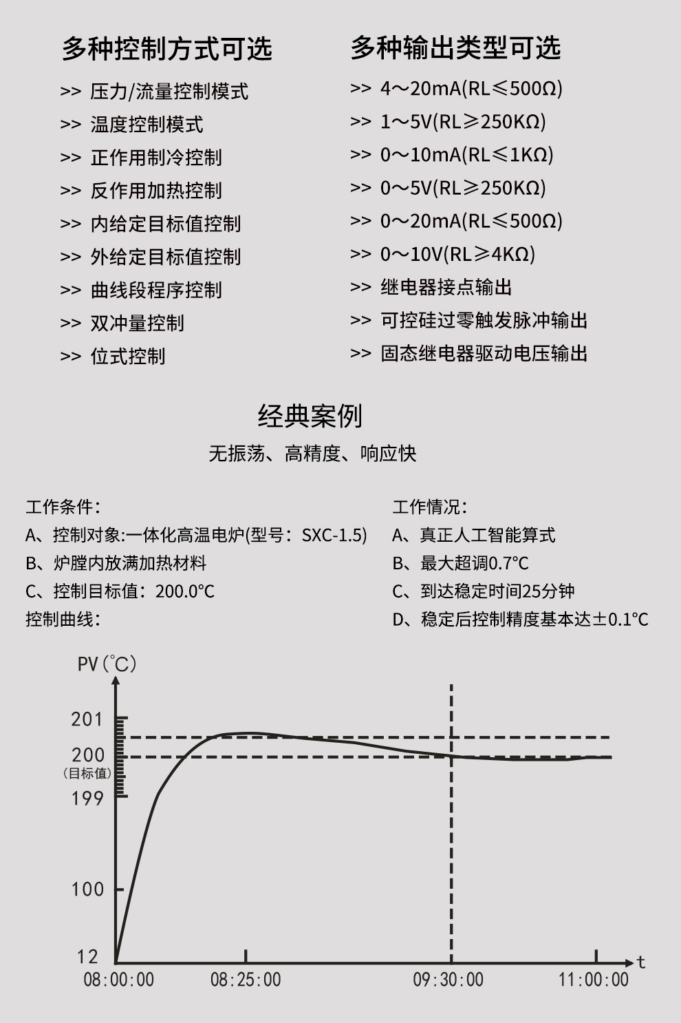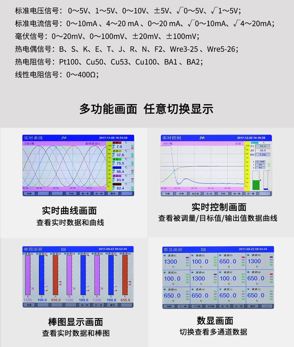 OHR-H300系列彩色調(diào)節(jié)無紙記錄儀采用真正的人工智能算式,儀表啟動(dòng)自整定功能,可根據(jù)被控對(duì)象的特性,自動(dòng)尋找最優(yōu)參數(shù)以達(dá)到很好的控制效果,無需人工整定參數(shù)??販鼐然具_(dá)±0.1℃,無超調(diào)、欠調(diào),達(dá)國(guó)際先進(jìn)水平。24路萬能輸入(可組態(tài)選擇輸入:標(biāo)準(zhǔn)電壓、標(biāo)準(zhǔn)電流、熱電偶、熱電阻、毫伏等)其中可帶8路控制輸入。