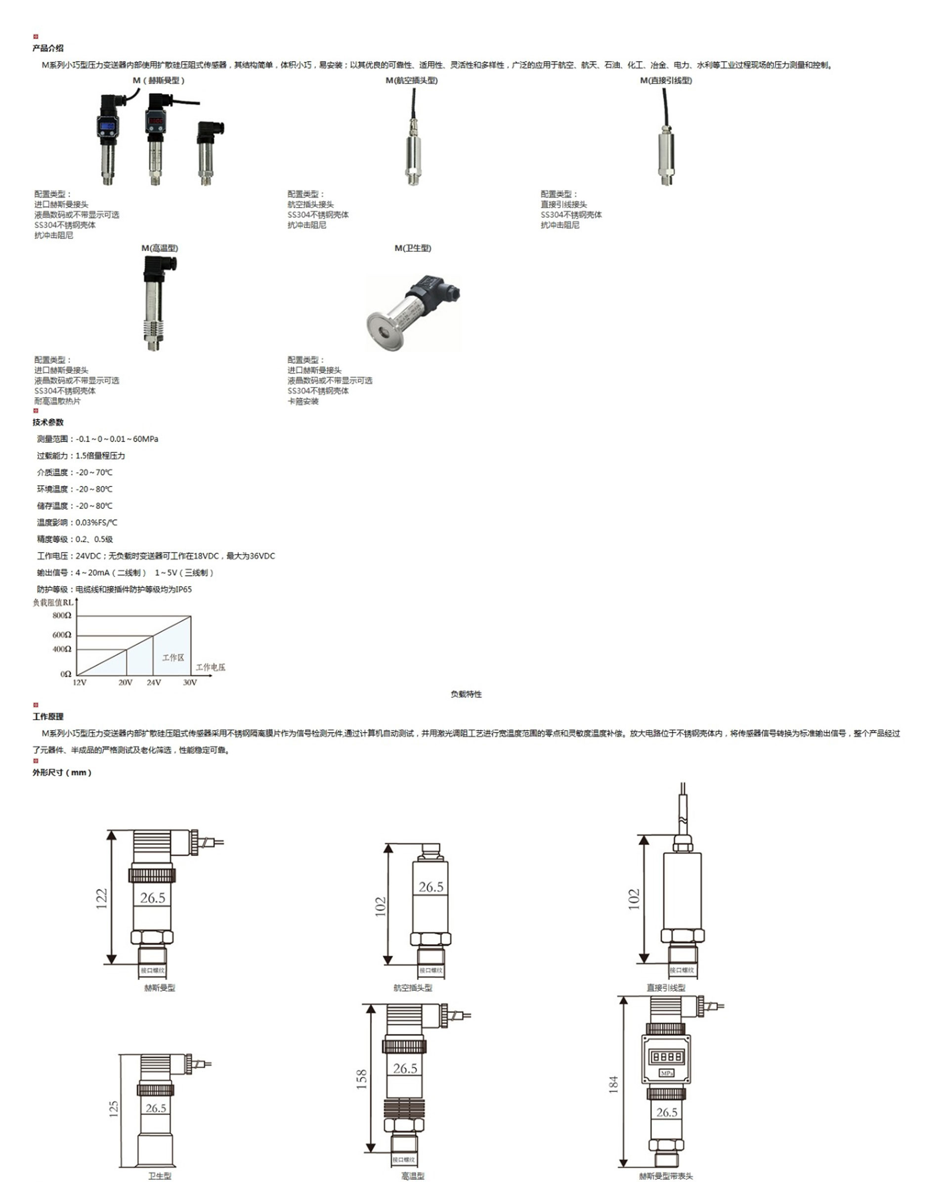 M系列小巧型壓力變送器內(nèi)部使用擴(kuò)散硅壓阻式傳感器,其結(jié)構(gòu)簡(jiǎn)單,體積小巧,易安裝;以其優(yōu)良的可靠性、適用性、靈活性和多樣性,廣泛的應(yīng)用于航空、航天、石油、化工、冶金、電力、水利等工業(yè)過程現(xiàn)場(chǎng)的壓力測(cè)量和控制。